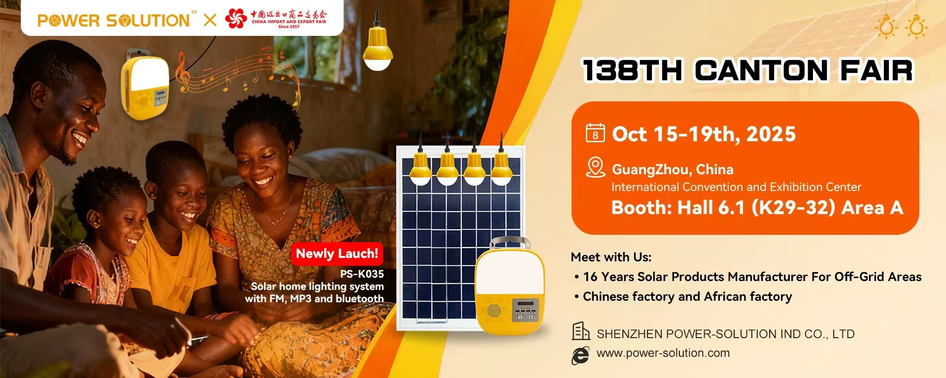 We are honored to invite you to visit us at the 138th Canton Fair (October 15-19, 2025, Booth Hall 6.1(k29-32), Area A. As a leading OEM/ODM manufacturer specializing in solar lighting system, solar home power system, portable solar systems, and customized photovoltaic solutions, we are excited to showcase our latest innovations tailored to your market needs. ... Read more